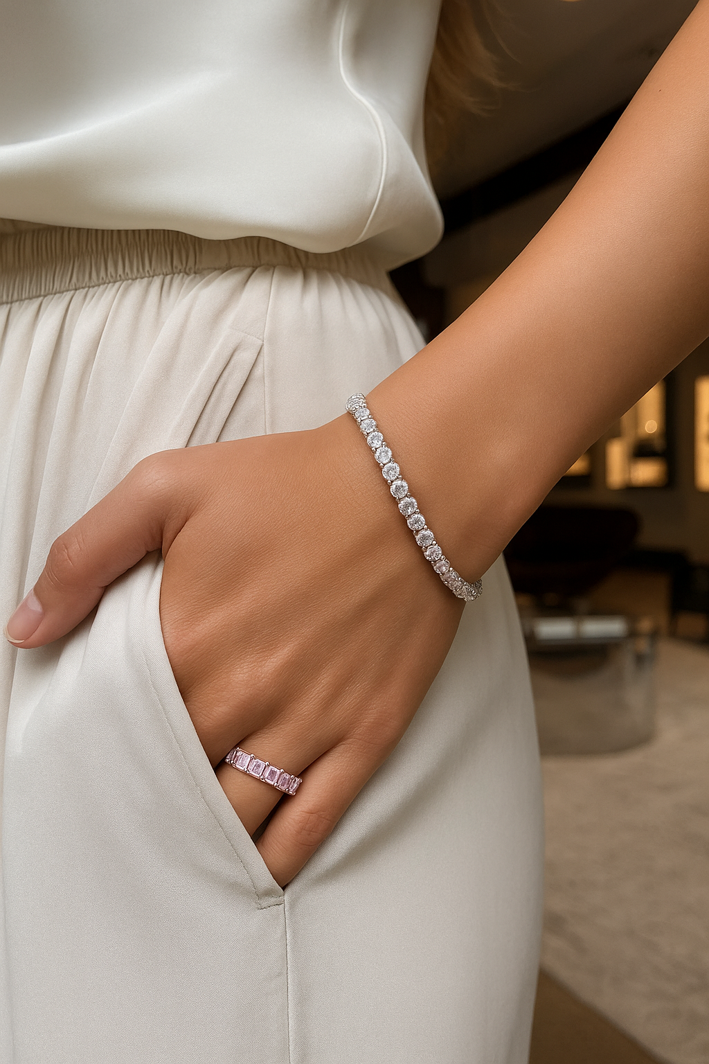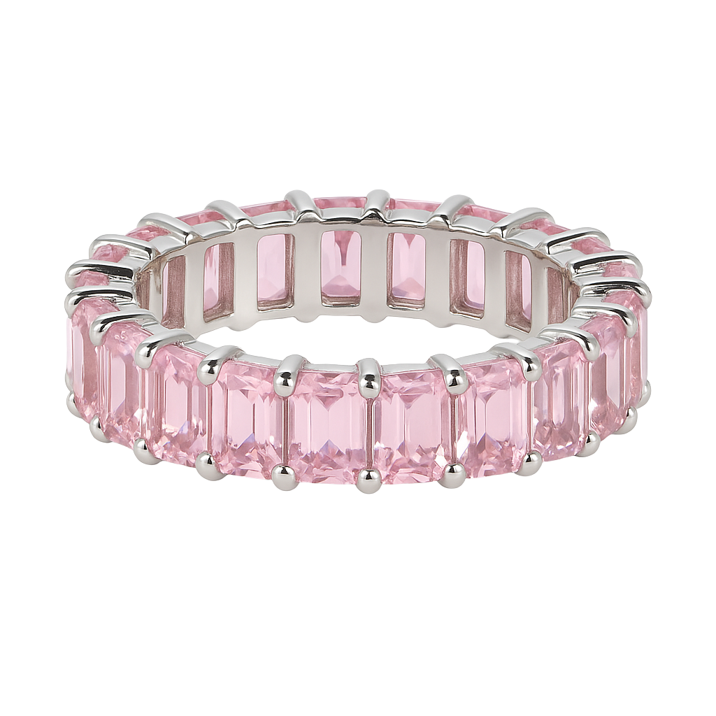 The Penthouse Eternity Band features a continuous row of precision-cut pink stones set in sleek sterling silver — designed to catch light from every angle. Its radiant, high-polish finish evokes the allure of penthouse evenings, champagne reflections, and timeless sophistication.
